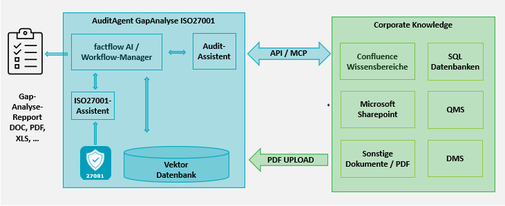 Unser factflow Workflow-Manager ist nun die zentrale Steuerkomponente und „vermittelt“ zwischen dem ISO27001-Assistenten und dem Audit-Assistenten. Die ISO27001-Audit-Leitfragen werden per KI und LLM an ihr Wissen gestellt und vollautomatisch ausgewertet. Sobald das Audit fertig ist, wird die Gapanalyse als Report in Form einer Excel-Datei oder in einem anderen Format bereitgestellt.